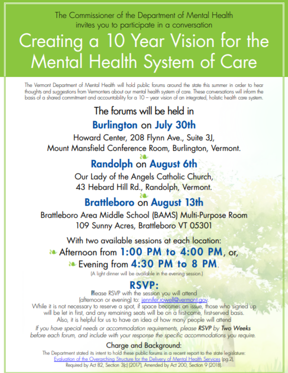 The second is an opportunity to attend a regional forum on the 10 year mental health care system vision.