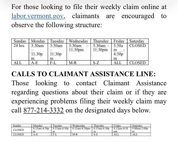 Those looking to establish an initial claim for unemployment insurance benefits may still do so any time online at labor.vermont.gov, or by calling 1-877-214-3330 or 1-888-807-7072 from 8:15am – 4:30pm on Monday through Friday, or from 9:00am – 3:00pm on Saturday.