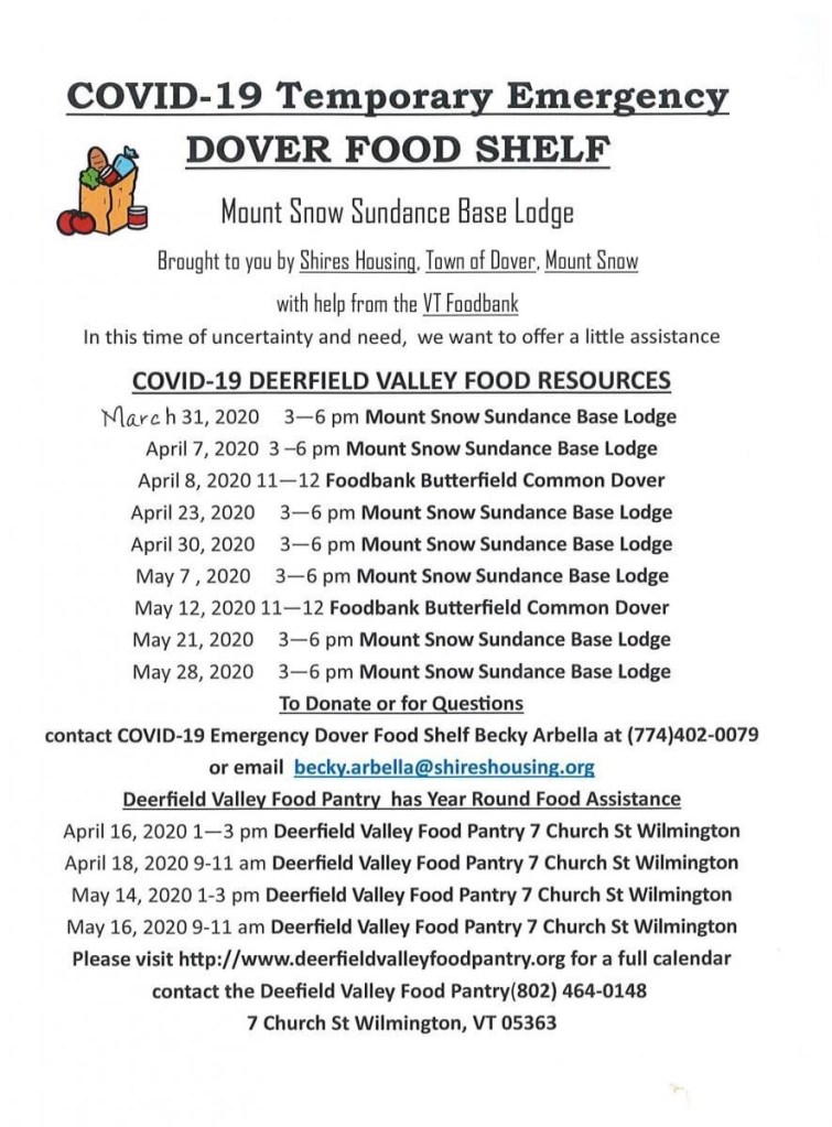 Thank you to those who have sent me emails with their contact information and the trouble they are experiencing with getting through to the Department of Labor. I did for ward the current list of names and details in today and will check back on Monday if problems are still existing. I heard from one individual that there were concerns folks did not have food. Please call me right away if you know of an individual who does not have food or shelter. There is also now a statewide feeding plan. The Vermont Food Bank and the Vermont National Guard are partnering to provide meals for pick up at several sites. If you are sick someone else can pick up food for you.