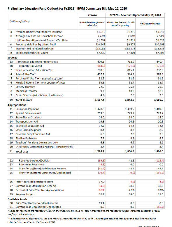 To the left is the preliminary education fund outlook. It reflects the budgets that voters in Vermont passed just at Town Meeting just prior to the declaration of the COVID emergency. The outlook also reflects that the education fund is looking at a potentially massive 150 million dollar shortfall due to it’s reliance on sales taxes. The House Ways and Means Committee asked members to approve the property tax yields bill so that towns could set their property tax rates, and told the body that a second bill, addressing the 150 million dollar shortfall would be coming. The Yield Bill which passed second reading by a vote of 127-20. I voted in favor of the bill. If the bill is enacted into law, the average homestead property tax rate would be $1.542 next year. That’s about 3 cents higher than the current rate.