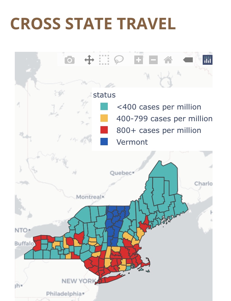 Effective June 8, the Governor has also authorized interstate travel to and from New England and New York counties with 400 or fewer active COVID-19 cases per million without quarantine requirements. A map of the approved counties will be updated weekly and posted on ACCD’s website. Vermonters planning to travel to other states should understand that each state may have its own quarantine policy and they should be familiar with, and respect, the quarantine policies of those states.