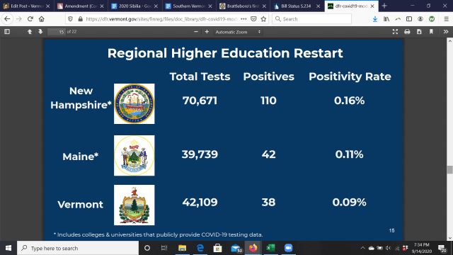 Good evening, on Friday Governor Scott extended the State of Emergency until October 15. The latest COVID-19 modeling showed Vermont holding steady in management of spread even after college students returned. This is great news! Tomorrow (Tuesday 9/15) the Governor will be joined at his regular 11 am press conference by Dr. Anthony Fauci, Director of the National Institute of Allergy and Infectious Diseases.