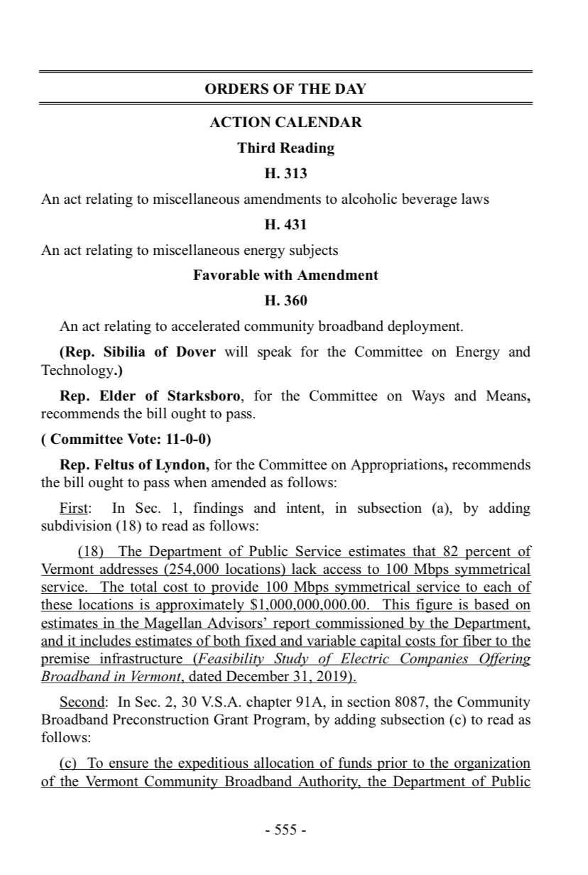 Tomorrow our Committee will report H.360 a proposal to accelerate community broadband deployment. The regulatory structure for our Telecom system that was established 25 years ago was based on “market competition providing the best service and lowest prices to Americans.” In many places that worked, but not in rural America and not in Vermont. It’s less profitable to provide internet service in rural Vermont, so it’s the last place private ISPs go.