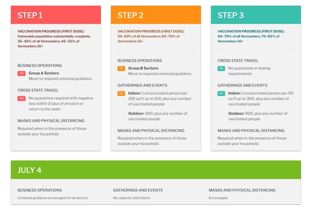 The Agency of Commerce and Community Development will lay out full guidance as each step forward is taken. All guidance updates will now be made available in a central location, at https://www.vermont.gov/vermont-forward.