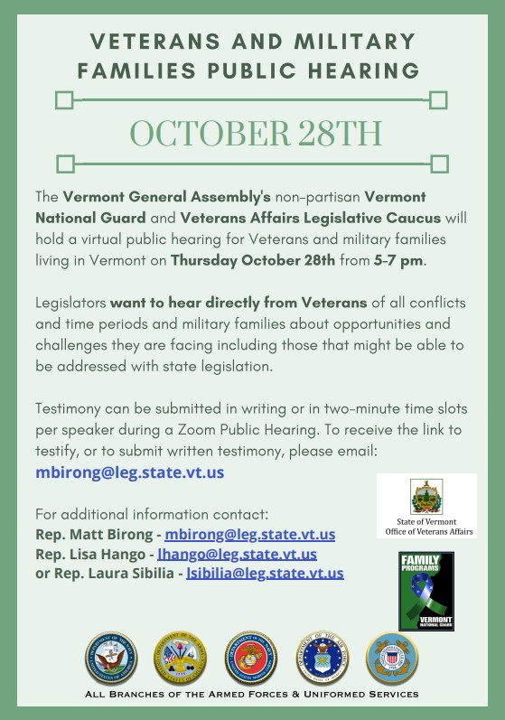 Three public hearings are included in this email. These are public hearings for those who live in rural communities, military veterans and their families, and those who are impacted by the Vermont education Finance Formula and student weighting. Participation by impacted individuals is important and easy and can be done from your home. Please let me know if I can help you sign up to testify