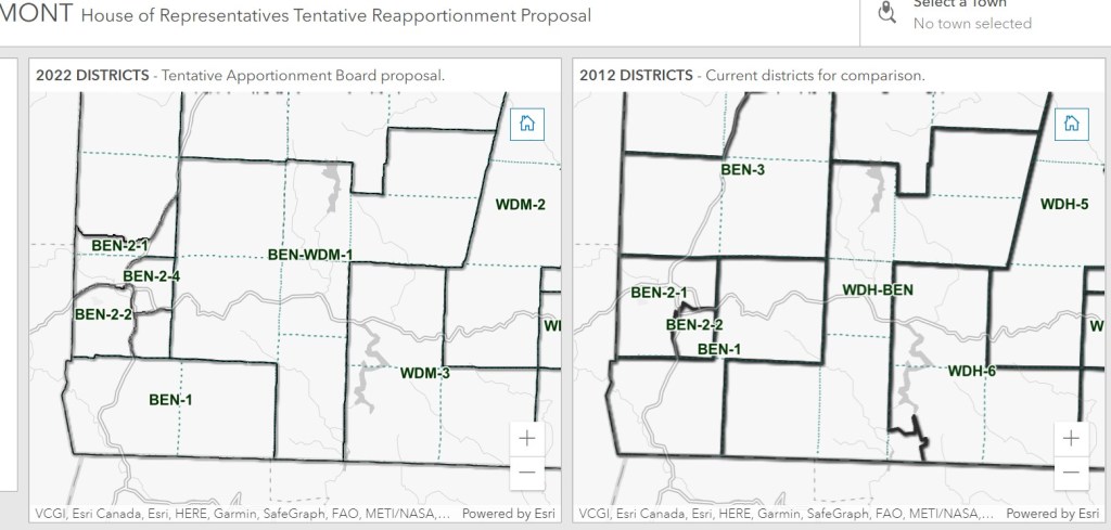 View the work of the board and previous map versions they considered. The first proposal for the Windham-Bennington District which we live and vote in would move Stamford into a district with Pownal and Woodford and Glastonbury into the Windham-Bennington District. This would create a legislative district with three supervisory unions in two counties, put Glastonbury in a separate district from the district it currently receives voting, trash and fire services from and would require Glastonbury residents to drive through other legislative districts to meet with Wardsboro, Dover, Woodford, Searsburg, Somerset and Readsboro voters in their district. This changing of districts would require Stamford to drive through MA to most quickly get to their fellow district community in Pownal.