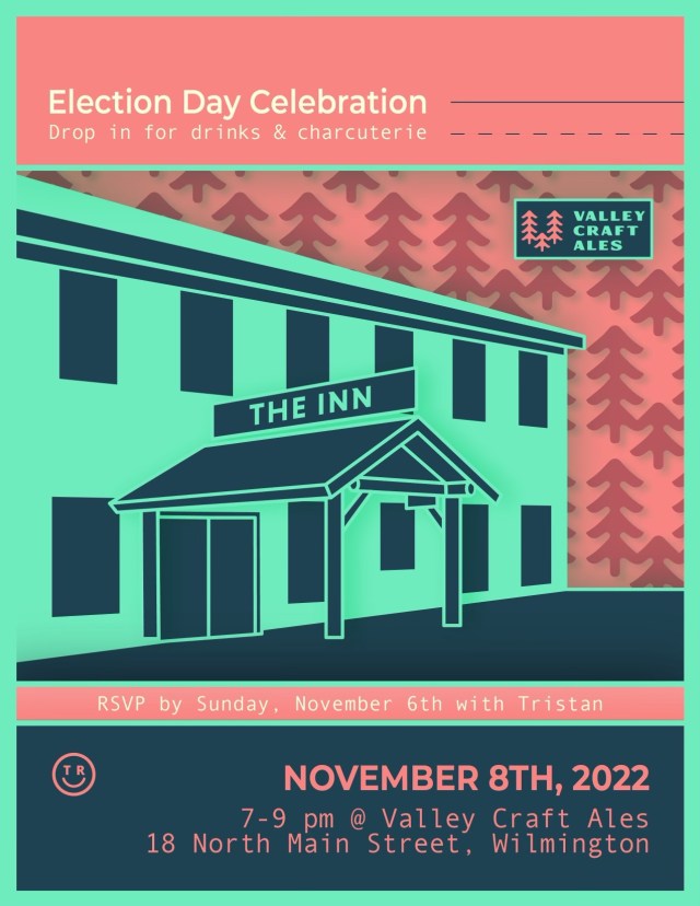 I will be out and about in the district at different polling places throughout the day and after the polls close I will head down briefly to congratulate Tristan Roberts of Halifax for his hard work and excellent communication in his campaign to be elected to represent the Wilmington, Whitingham, Halifax District. Tristan entered the race after a last minute announcement by Rep. John Gannon that he would not run again and is holding an election night gathering from 7-9 at the Valley Craft Ale House (former Old Red Mill). Please join me in congratulating him for a respectful, inclusive and law abiding campaign throughout the Windham-6 district.