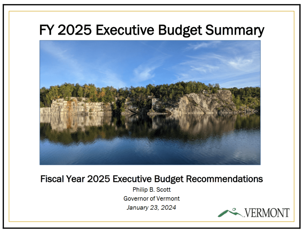 Governor Scott delivered his Proposed FY2025 Budget to run state government agencies and programs. The budget is $8.6 billion across all funds, including $353 million for Transportation, $2.4 billion for Education, and $2.3 billion for General Fund. His proposed overall General Fund growth is capped at 3.6% over last year’s budget. The Governor highlighted his long standing priority of affordability, plus housing regulations and addressing crime. The budget is now being considered by the House Appropriations Committee which will likely have a public input session to hear from Vermonters before sending the budget to the Senate. Want to read the high level details of the gov’s budget? Click the image below: