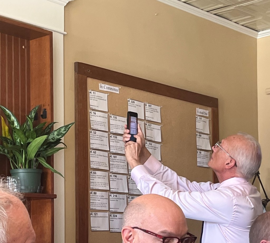 Here is a photo of Guy Page, editor of the Vermont Chronicle, known for its far-right perspective, capturing GOP efforts to repeal the Clean Heat Standard as embodied in bills on our committee wall. These attempts are rooted in misleading claims about the policies cost – today the claim of “billions” was made on social media, despite the policy not even being implemented.