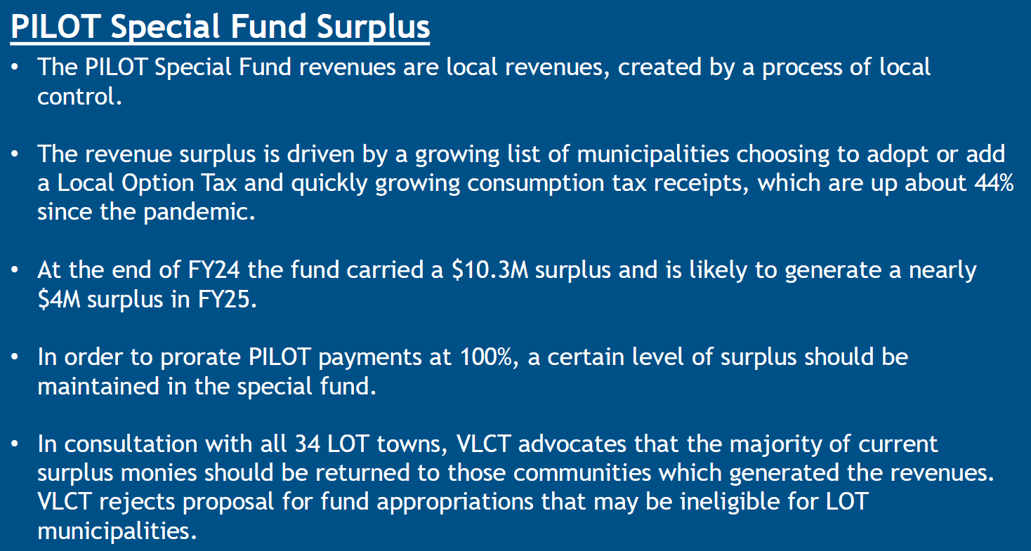 As many of you know, the Local Option Tax (LOT) allows municipalities to generate revenue by adding a 1% tax on sales, meals, alcoholic beverages, and rooms. In Southern Vermont, towns like Dover, Stratton, Jamaica, and Wardsboro have been benefiting from this system. However, the state’s Payment in Lieu of Taxes (PILOT) program has accumulated a nearly $10 million surplus, meaning that our nine rural communities are overpaying into the system.