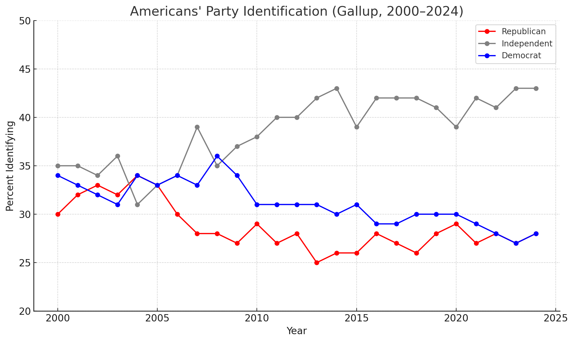 Recent New York Times reporting highlights that more Americans are rejecting the two major parties. Gallup data shows this is not new. Independent voters have been rising for more than two decades. What has changed is the balance: Democrats have slipped from the mid-30s to the high 20s, Republicans have stayed steadier in the 20s, and independents are now the largest group of voters.