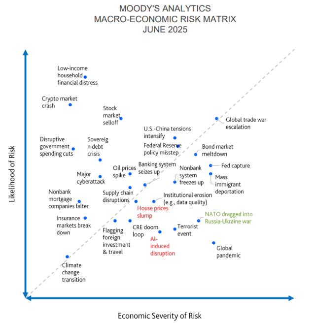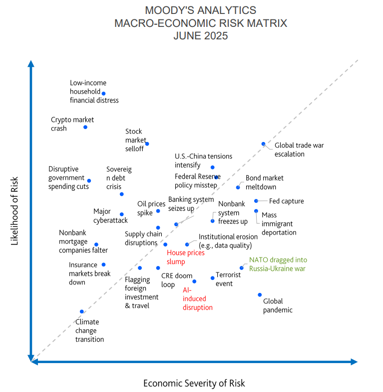 The chart plots different risks by: How likely they are to happen (up the side), and How big the economic impact would be (across the bottom). Some risks like household financial distress, oil price spikes, or a stock market selloff are more likely and could pinch Vermonters directly at the gas pump, in retirement accounts, or in household budgets. Others—like a global trade war or NATO being dragged into the Russia–Ukraine war—are less likely, but could have very large economic consequences if they occurred.