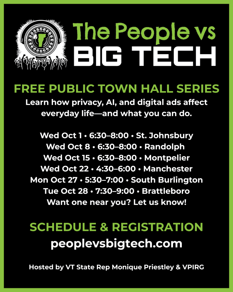 A new statewide series, People vs. Big Tech: Vermont, is bringing free, public conversations on privacy, AI, and digital power to communities across Vermont. Events include expert briefings, audience dialogue, and steps Vermonters can take to protect themselves while pushing for smarter, people-first policy.