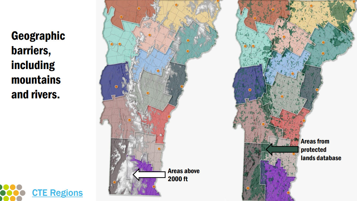 Mapping efforts are also underway. Some scenarios use Career and Technical Education (CTE) regions (photo above) as potential district boundaries. Others draw from BOCES models or transportation data.