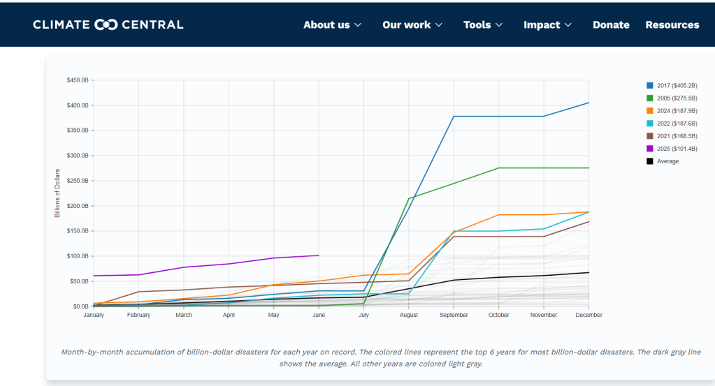 Vermont communities are still rebuilding after this summer’s floods and severe storms — as the first half of 2025 has become the costliest start to any year on record for U.S. climate disasters, with over $100 billion in damages from wildfires, tornadoes, and extreme weather (Climate Central). These national trends shape Vermont’s recovery needs, insurance rates, and infrastructure priorities.