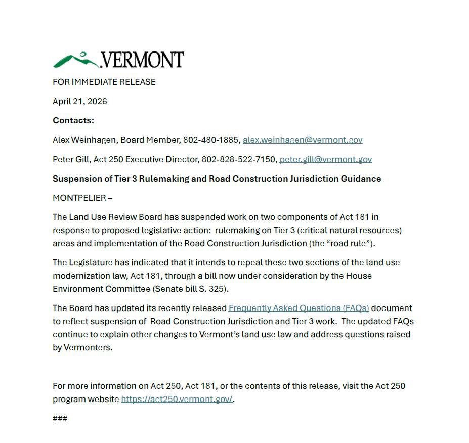 There has been a lot of recent activity, including committee discussions. Tier 3 and the Road Rule are likely to be repealed. These provisions expanded when Act 250 would apply, particularly around certain development areas and road construction, and have raised significant concerns about cost and impact on rural landowners. Read more here: https://laurasibiliavt.com/2026/03/31/sibilia-land-use-policy-wont-work-if-vermonters-arent-part-of-it/